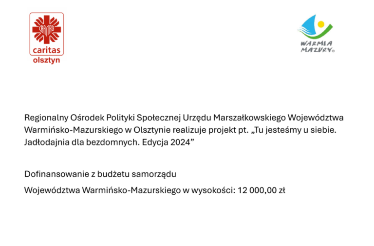 Zadanie publiczne „Tu jesteśmy u siebie. Jadłodajnia dla bezdomnych. Edycja 2024” jest realizowane przez Caritas Archidiecezji Warmińskiej na zlecenie Wojewody Warmińsko Mazurskiego i jest dofinansowane z budżetu samorządu Województwa Warmińsko-Mazurskiego.
