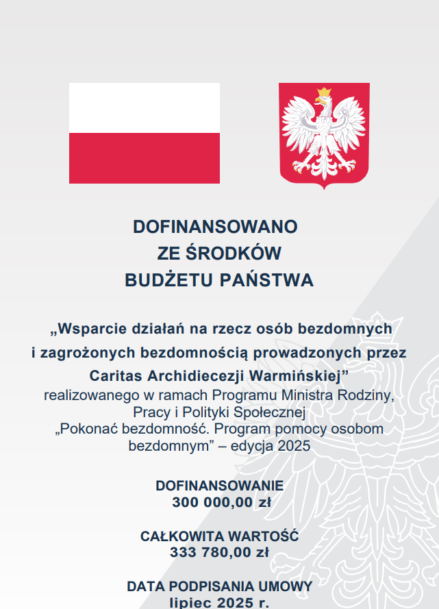 Zadanie publiczne „Wsparcie działań na rzecz osób bezdomnych i zagrożonych bezdomnością prowadzonych przez Caritas Archidiecezji Warmińskiej” realizowane jest w ramach Programu Ministra Rodziny, Pracy i Polityki Społecznej „Pokonać bezdomność. Program pomocy osobom bezdomnym” – edycja 2025.” i jest dofinansowane ze środków Budżetu Państwa.